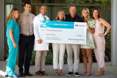 Sarcoma research gained traction after Shingle Springs Subaru presented an $80,000 check to the UC Davis Comprehensive Cancer Center as part of the 2022 Subaru of Americas Share the Love Event. This represents the third year of partnership between UC Davis Health and the Shingle Springs Subaru owners Bryant and Kirsten McCarver to support children, adolescents, and young adults battling cancer in the Sacramento Region. Inspired by the treatment of their daughter Kate during her sophomore year of high school, Bryant and Kirsten McCarver decided that they wanted to help kids battling cancer in the communities they serve through their dealership. Dr. Lor Randall, Chair of the Department of Orthopaedic Surgery and internationally recognized sarcoma surgeon and scientist, removed Kates cancer, and fortunately, she remains cancer free. The funding provided by the Shingle Springs Subaru, Share the Love event is changing lives. UC Davis Health Sarcoma Services is comprised of an integrated team of internationally recognized experts, said Dr. Randall. I am incredibly grateful as we continue to provide research contributions at such a critical time for programs in musculoskeletal science, our educational efforts for emerging providers, and our patient community. The partnership with Subaru Share the Love helps move the needle for better patient outcomes. Partnership and collaboration are vital to success. Expert care is available in our region for families. Shingle Springs Subaru and Share the Love make it possible to push our research efforts to improve treatments and outcomes. Meet Lydia: It was spring 2019, and the Alwan family had returned home from skiing when eldest daughter Lydia began complaining of leg pain. Likely a pulled muscle, they thought. But as the pain worsened, it began waking her up at night, so her parents made an appointment to see her pediatrician. We took Lydia in and had an exam and x-rays. When we got the news, it felt like the world just stopped, said Lydias mom, Jessica Alwan. Lydia had osteosarcoma. Osteosarcoma is a type of bone cancer that tends to occur in teenagers and young adults but can also affect younger children. Treatment for osteosarcoma usually involves chemotherapy, surgery, and sometimes radiation therapy. Doctors select treatment options based on the location, size, type, and grade of the osteosarcoma and whether the cancer has spread beyond the bone. Lydias cancer was in her mid-femur, and there was no time to waste, Alwan said. We had to get up to speed quickly. Alwan and her husband began their quest to get the best in surgical and oncological care for their daughter. To save her leg, we needed an expert surgeon, but we also needed a great oncologist, Alwan said. We discovered both at the UC Davis Comprehensive Cancer Center and were confident in her team to guide us in making some of the most important decisions of our lives. Musculoskeletal surgical oncologist expert Dr. Lor Randall and pediatric oncologist Dr. Elysia Alvarez were the dream team the Alwans had hoped for. And they found them just down the hill from their home in Auburn. Not only were these doctors the best, but they were also so close by, Alwan said. We knew Lydias chemotherapy treatments were going to be intense and would require her to be admitted to the hospital for days, if not weeks at a time. To not have to travel further was a gift. We also have two other children we had to take care of. The location made it easier to manage. Subaru Share the Love is changing the lives of patients like Lydia. In addition, partnerships like this improve the lives of families in our region. We are ensuring the highest quality treatment close to home.